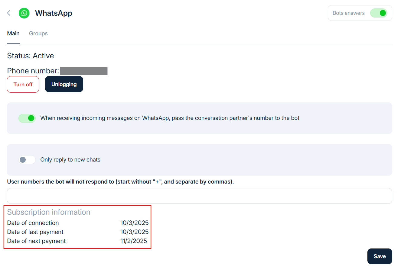 6. To enable the bot to automatically detect the interlocutor's phone number, allow the **transmission of the interlocutor's number to the bot:**