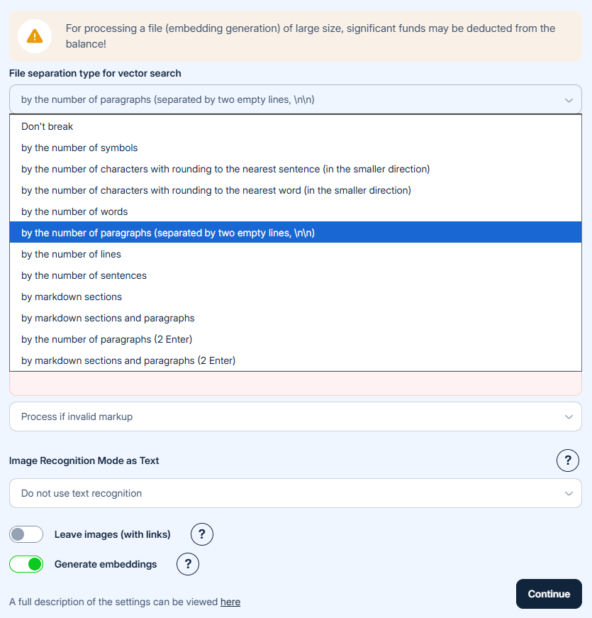 Before uploading the document, it is important to check it and segment it correctly into paragraphs. Two consecutive line breaks are used as separators. Therefore, before uploading, the document must be analyzed and correctly prepared for segmentation, considering both semantics (context) and gaps between paragraphs. It's also important to note that the size of a single chunk cannot exceed **2048** characters.