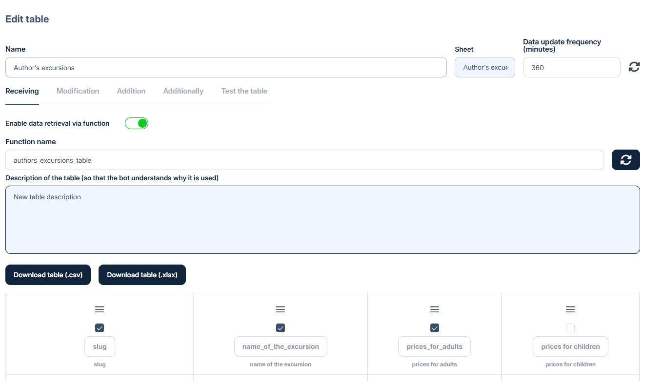 To connect a table, go to the **Tables** section in the bot settings and choose one of the connection options: