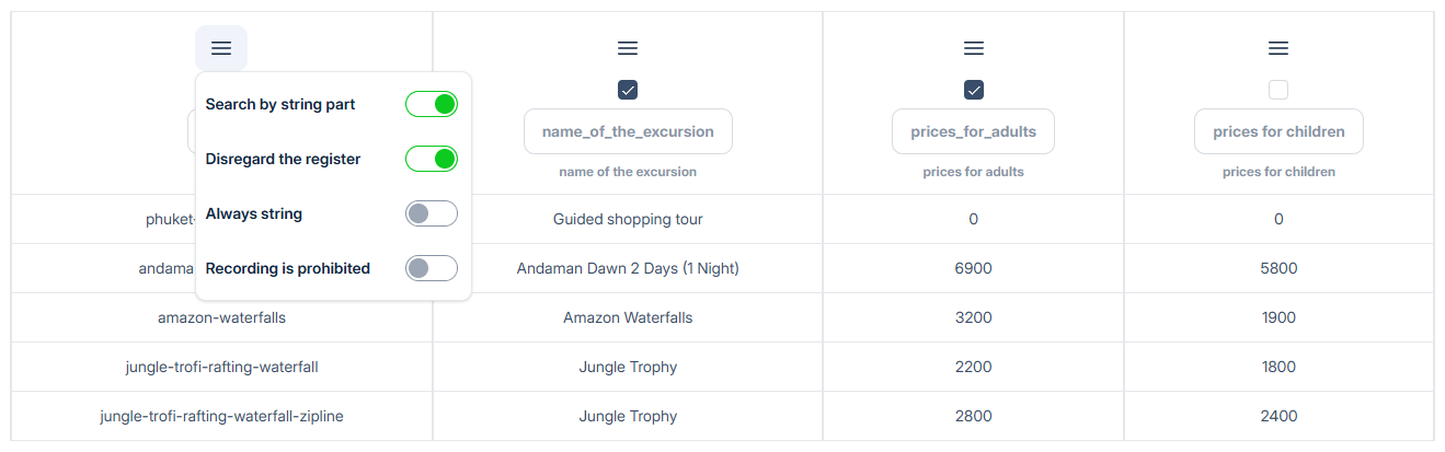 **Search by part of the string** - allows finding data in the table even if part of the text from the column was given.