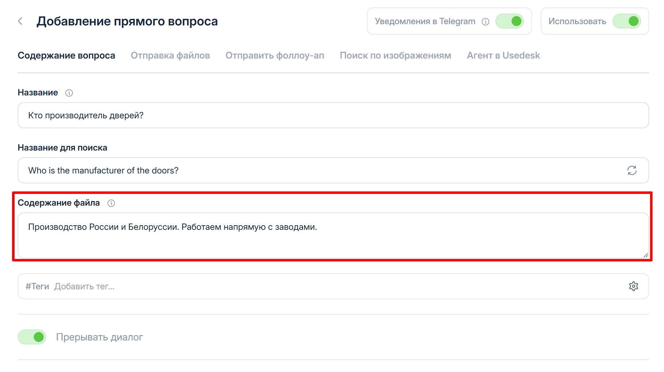 > Например, прерывание нужно, когда вы хотите передать диалог живому сотруднику и чтобы бот, после данного ответа прекратил давать ответы на любые вопросы клиента.